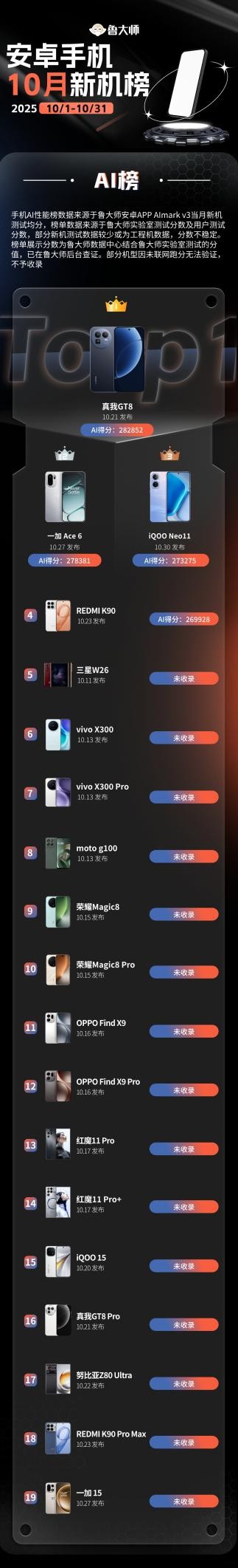 10新机AI榜,由于目前搭载骁龙8 Elite Gen5、天玑9500新旗舰手机的AI跑分波动较大,为了榜单的准确性,鲁大师后台暂时不予收录,后续恢复正常后,将在鲁大师月、季报中第一时间体现。因此本月仅收录几台上代骁龙8至尊版新机。