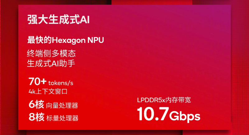 这里,咱们先回顾下骁龙8至尊版的AI能力,其AI处理器 Hexagon NPU,相较再之前的8 Gen3 AI性能提升可以说是跨越级,推理速度提升了45%,每瓦的性能表现提升了45%,支持端侧70+tokens/s的输入处理能力。