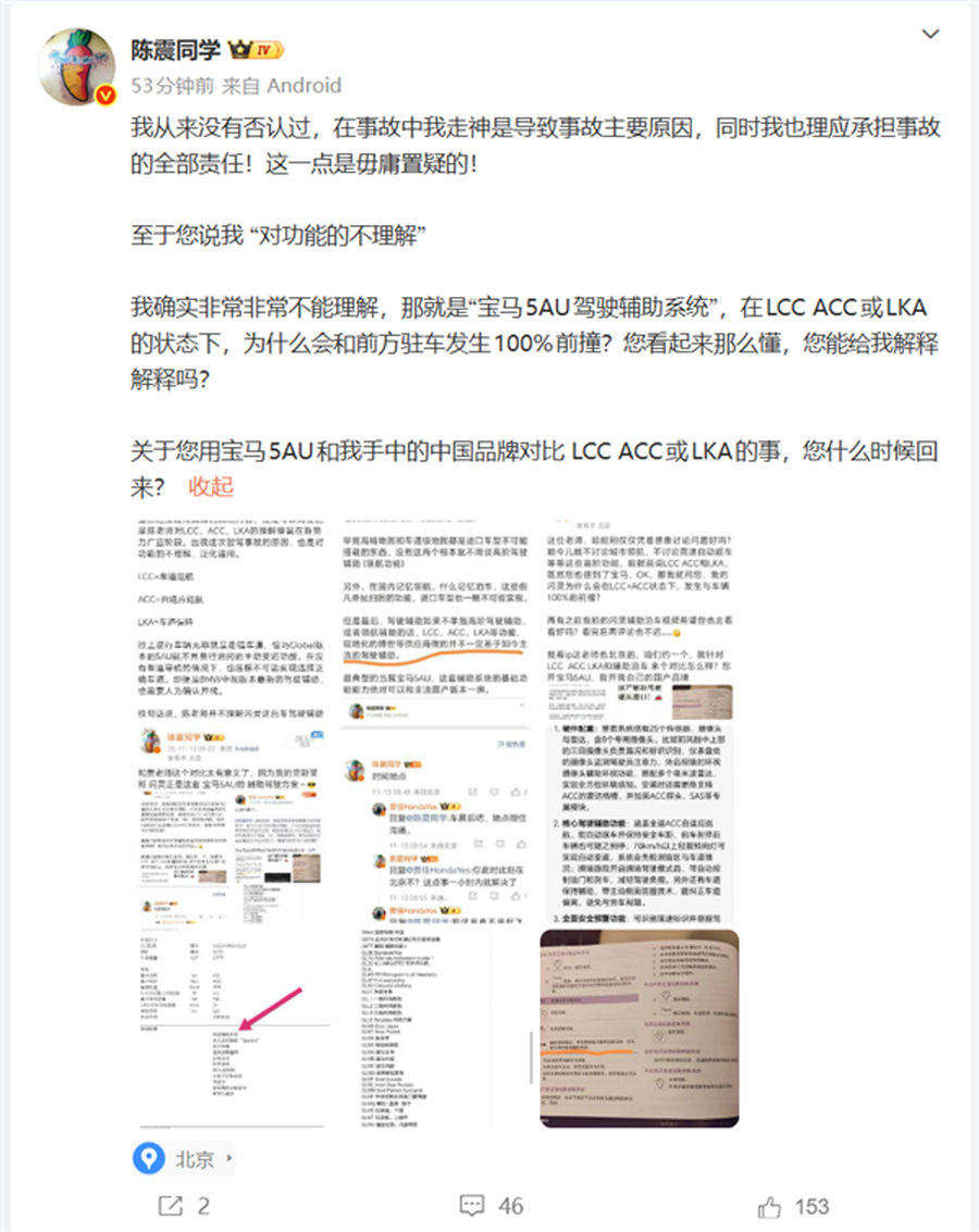 陈震进一步指出,虽然自己没有“甩锅”,但他通过亲身经历向大家提醒,某些辅助驾驶配置可能并不可靠。他提到,尽管闪灵配备了高端的辅助驾驶技术,但在实际操作中,这些技术却未能如预期般有效,尤其是最基础的主动安全功能似乎存在缺陷。
