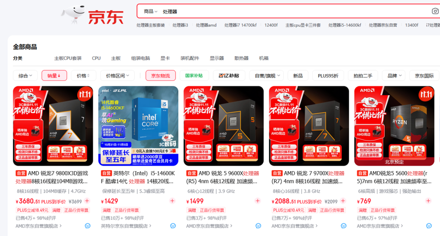 大家只要京东商城搜索“处理器”,选择京东自营产品按照销量排列就一目了然了,来自AMD(超威)的锐龙9 9800X3D成为了这个11.11大促高潮期最卖座的处理器,对于游戏玩家来说这真的是众望所归了,这款被DIY玩家们奉为“游戏神U”的产品就是目前游戏性能天花板级别的处理器,想拥有极致游戏体验的玩家们是绝 对不能错过的,下面就为大家再来详细介绍一下这款“销冠”。