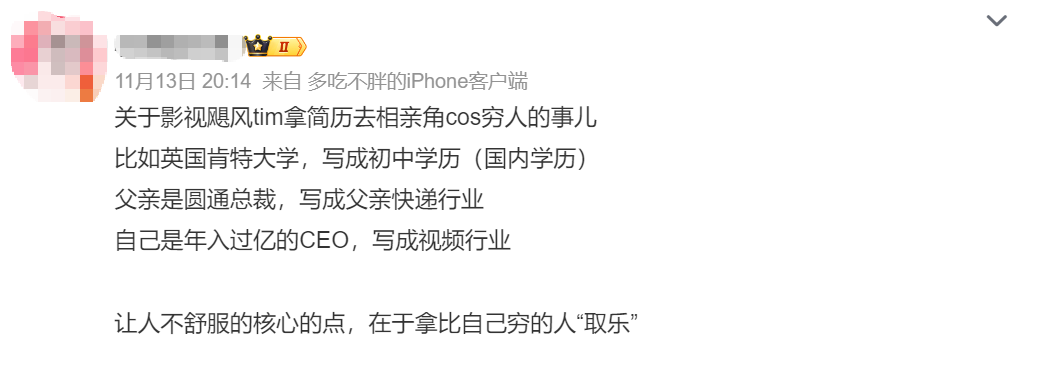 一些网友认为,TIM故意隐瞒了自己的学历背景和家庭背景,尤其是他毕业于英国肯特大学电影系,以及他的父亲是圆通高管的身份。