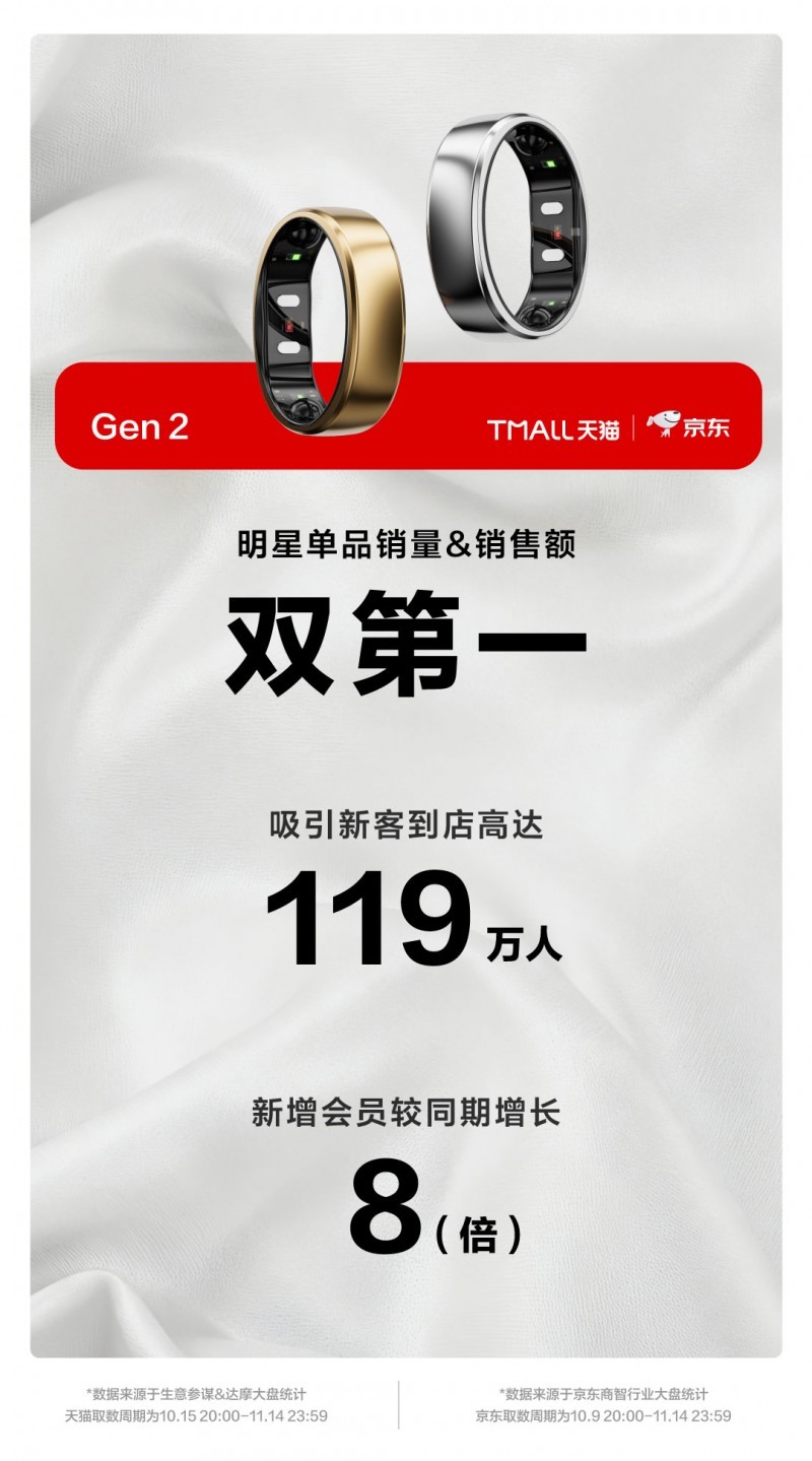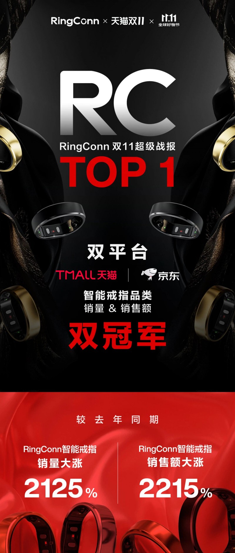 11月14日,2025年双11购物狂欢正式收官,中国智能戒指开创者RingConn对外公布了双11战报。据官方战报显示,双11期间RingConn智能戒指斩获天猫、京东双平台智能戒指品类销量与销售额双冠军,较去年同期销量大涨2125%,销售额大涨2215%,持续创新高。这一亮眼成绩不仅彰显了RingConn在智能穿戴领域的领先地位,更印证了市场对智能戒指这一健康创新品类的旺盛需求。