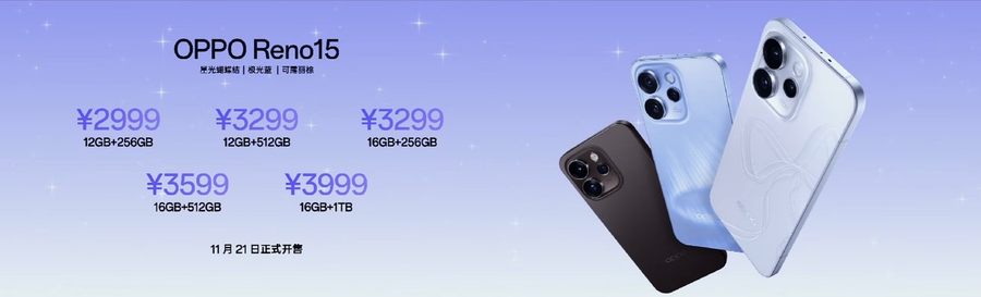 Reno15 提供星光蝴蝶结、极光蓝、可露丽棕三种配色,12GB+256GB 版本定价 2999 元;12GB+512GB 版本定价 3299 元;16GB+256GB 版本定价 3299元;16GB+512GB 版本定价 3599 元;16GB+1TB版本定价 3999元。