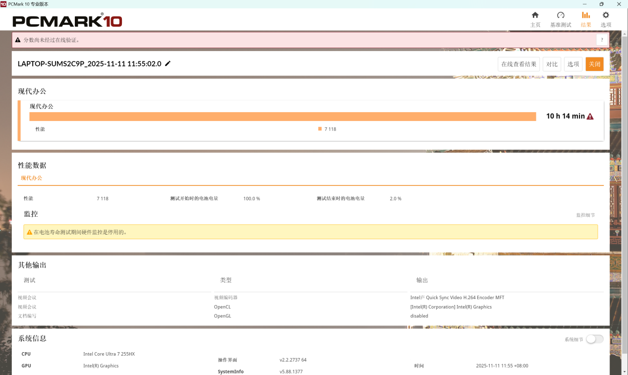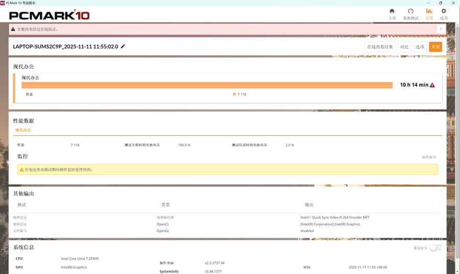 我们首先使用PCMark 10当中的现代办公测试,来看看在负载较轻的测试当中续航表现如何。可以看到最终天选6 Pro酷睿版的续航达到了10小时14分钟,拥有着非常不错的表现,尽管这项测试的总体负载较低,但是这样的续航时长也能够满足绝大多数人一天的使用需求了。