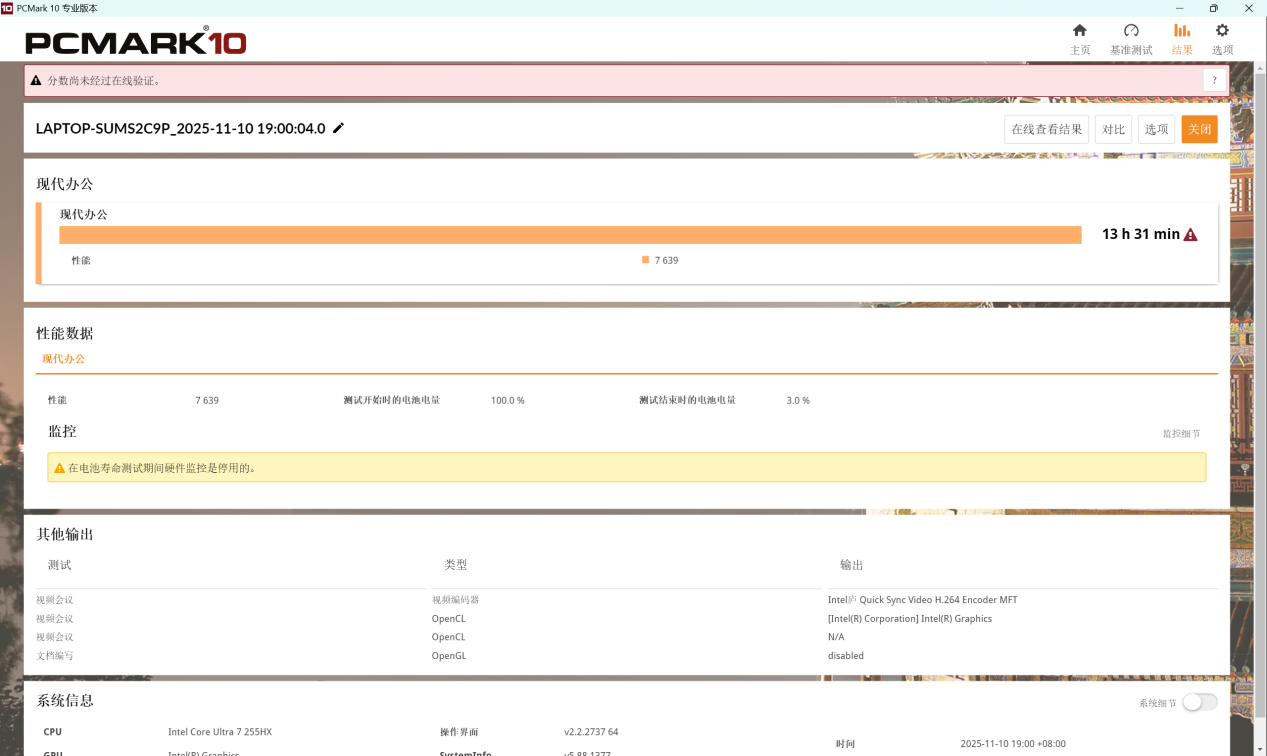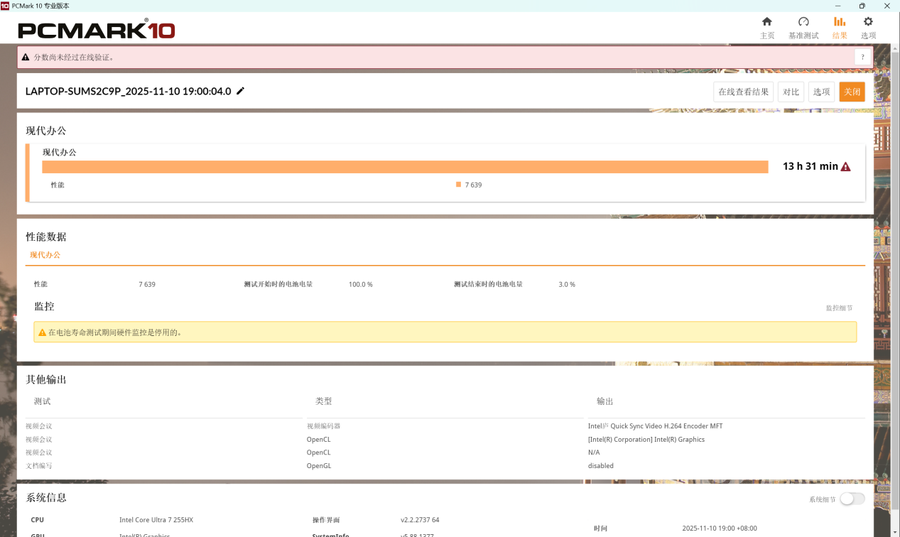 依旧使用PCMark 10当中的现代办公测试,在负载较轻的测试当中最终天选6 Pro酷睿版的续航达到了13小时31分钟,续航时间进一步的拉长了,这样的续航时间几乎可以媲美甚至是超过一些轻薄本了,表现相当不错。