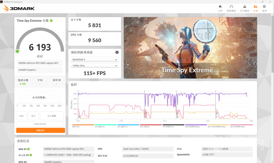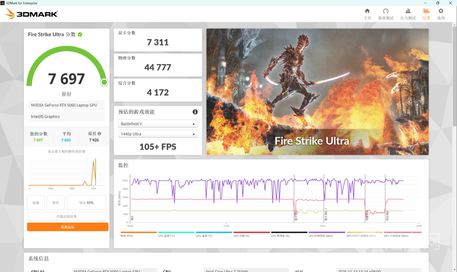 在3DMark测试中,天选6 Pro酷睿版在Fire Stike Ultra当中得到7697分,TimeSpy Extreme当中得到6193分,即使是在这两项4K分辨率的基准测试当中也有着非常出色的表现。