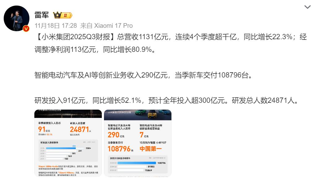 卢伟冰还谈到,小米的经营策略正在发生转变,从以往的“以规模优先”,逐渐向“利润和规模并重”转型。他指出,当前手机市场总体上仍属于存量市场,在这种情况下,手机产品的质量和体验都已经非常优秀,用户主动换机的动力减弱,因此部分产品价格上涨后,用户可能会选择延迟购买。