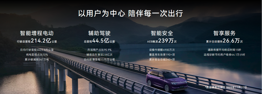 截至目前,问界已得到90万用户的信任,智能增程电动行驶总里程超214亿公里,纯电行驶里程占比达70%,辅助驾驶总里程已超过44.5亿公里,辅助泊车激活次数达到2.8亿次,凭借硬核产品实力与用户口碑沉淀,持续领跑新能源赛道。