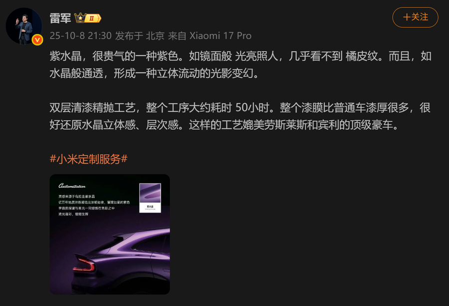 雷军此前就在微博中对紫水晶车漆进行了详细介绍,称这种紫色极具贵气感,类似镜面般的光亮照人,几乎看不到橘皮纹,呈现出如水晶般的通透效果。紫水晶漆的光影变化立体流动,给人一种非凡的视觉体验。他特别提到,采用的双层清漆精抛工艺非常复杂,整个漆膜比普通车漆厚,能够很好地还原水晶般的立体感和层次感,堪称工艺上的极致之作。