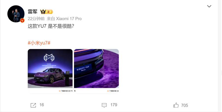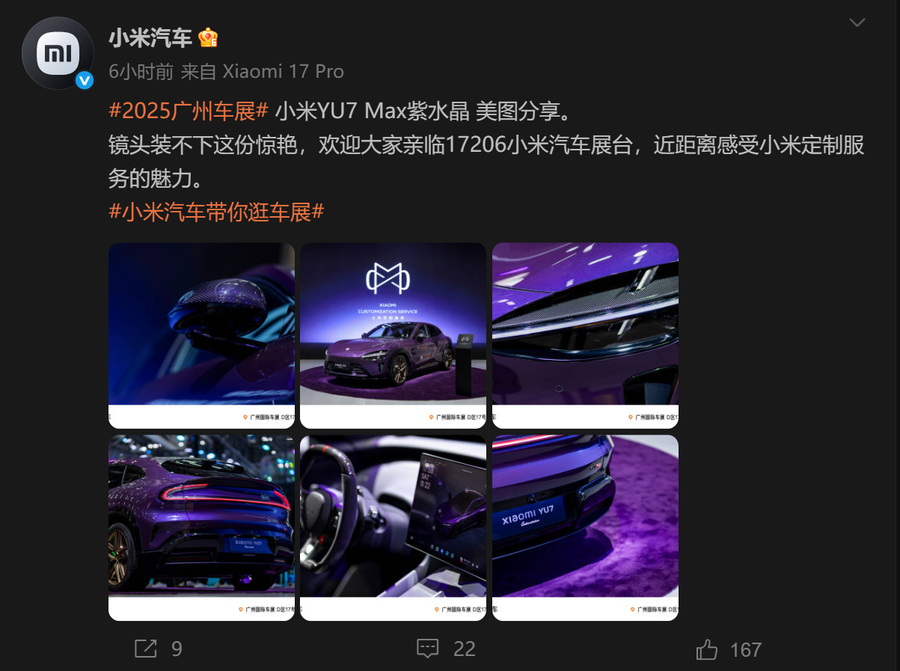 在近日的广州车展上,小米首次展示了YU7 Max紫水晶版,并发布了一组新车的实拍美图。这款车的外观工艺引起了广泛关注,小米汽车官方表示,现场的展台为大家提供了近距离感受小米定制服务的机会。小米汽车设计师田原还特别介绍了紫水晶车漆的独特之处,强调它是一种特别定制的车漆,拥有“不张扬的高级感”,并通过近50小时的手工打磨完成,展现出深邃与璀璨的光泽。