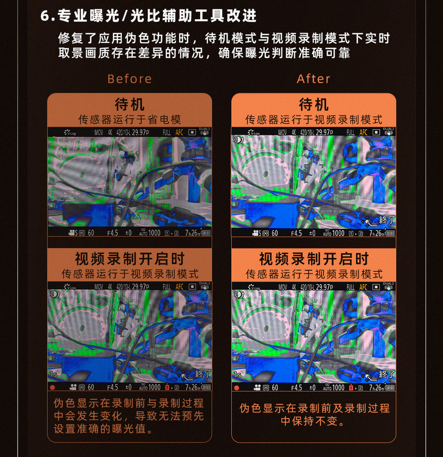 修复了应用伪色功能时,待机模式与视频录制模式下实时取景画质存在差异的情况确保曝光判断准确可靠。