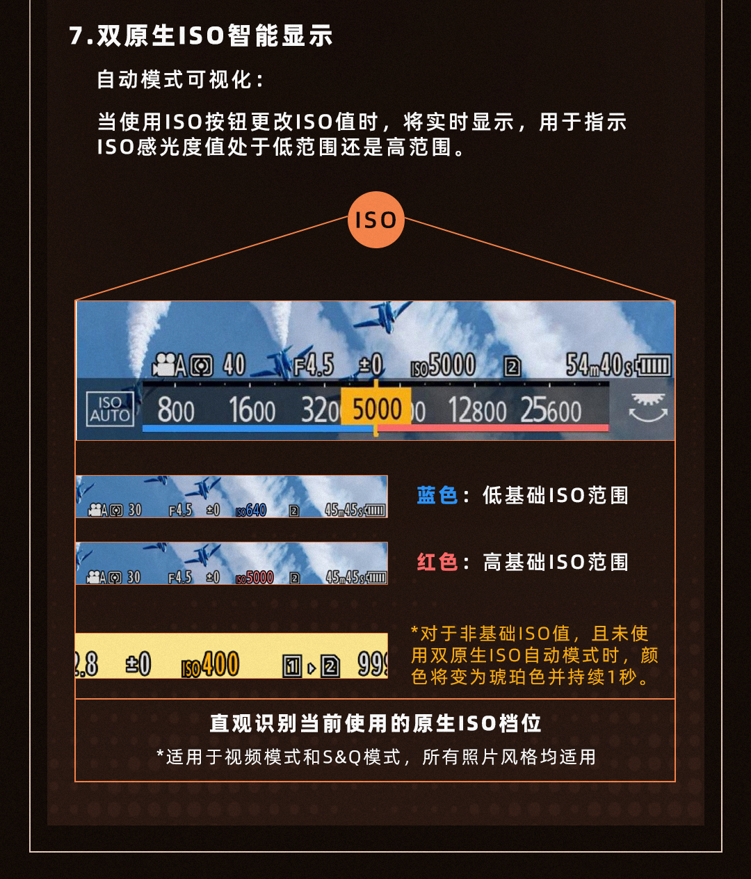 *对于非基础ISO值,且未使用双原生ISO自动模式时,颜色将变为琥珀色并持续1秒。直观识别当前使用的原生ISO档位