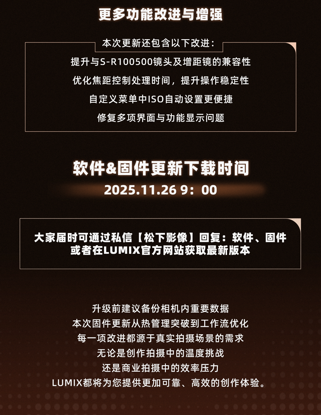 升级前建议备份相机内重要数据,本次固件更新从热管理突破到工作流优化,每一项改进都源于真实拍摄场景的需求。无论是创作拍摄中的温度挑战,还是商业拍摄中的效率压力,LUMIX都将为您提供更加可靠、高效的创作体验。