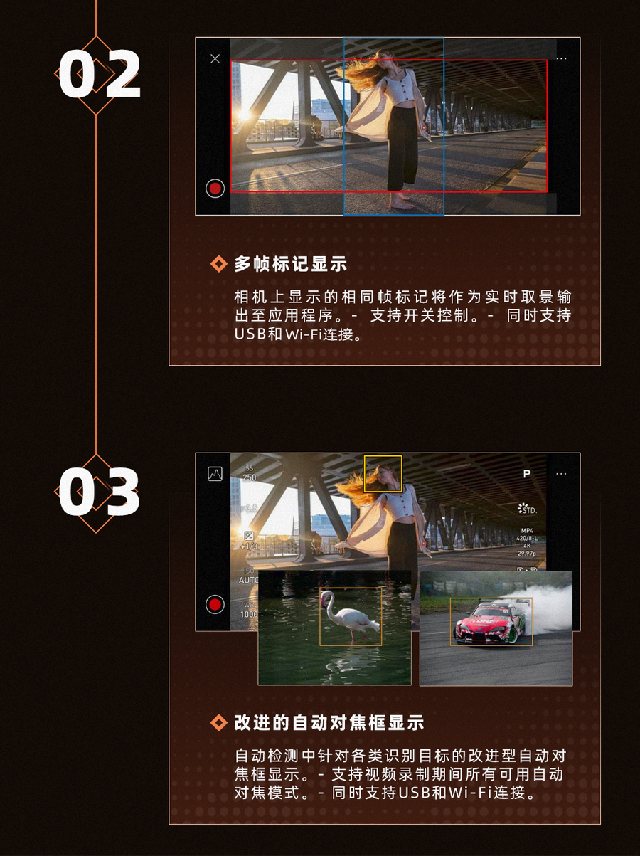 相机上显示的相同帧标记将作为实时取景输出至应用程序。