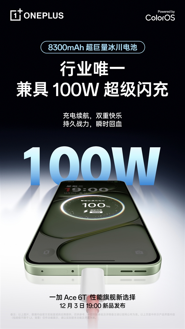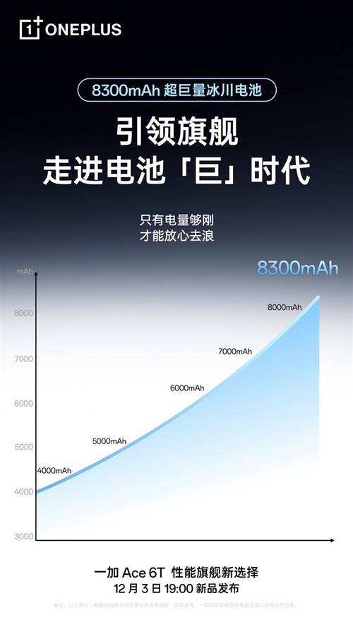 今日,一加中国区总裁李杰介绍了即将发布的一加Ace 6T,宣布该机将全球首发8300mAh超巨量冰川电池,成为目前全球电池容量最大的性能旗舰手机。这一举措标志着旗舰手机电池容量正式迈入8000mAh+时代。