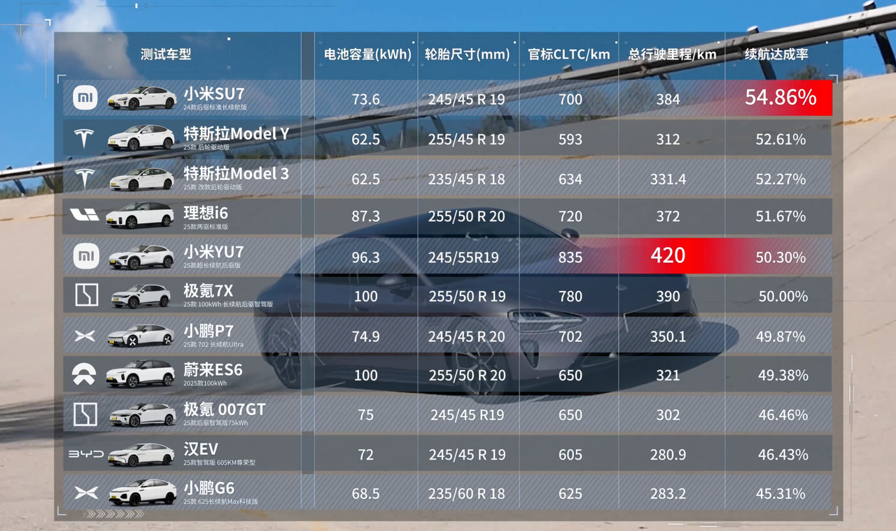 最终,小米SU7凭借其73.6度电池在测试中跑了384公里,达成率54.86%,成为20万级别车中续航达成率最高的车型;而小米YU7则以96.3度电池,实际续航达到420公里,成为全场跑得最远的车型,这两项成绩都无疑为小米汽车的续航能力加分。