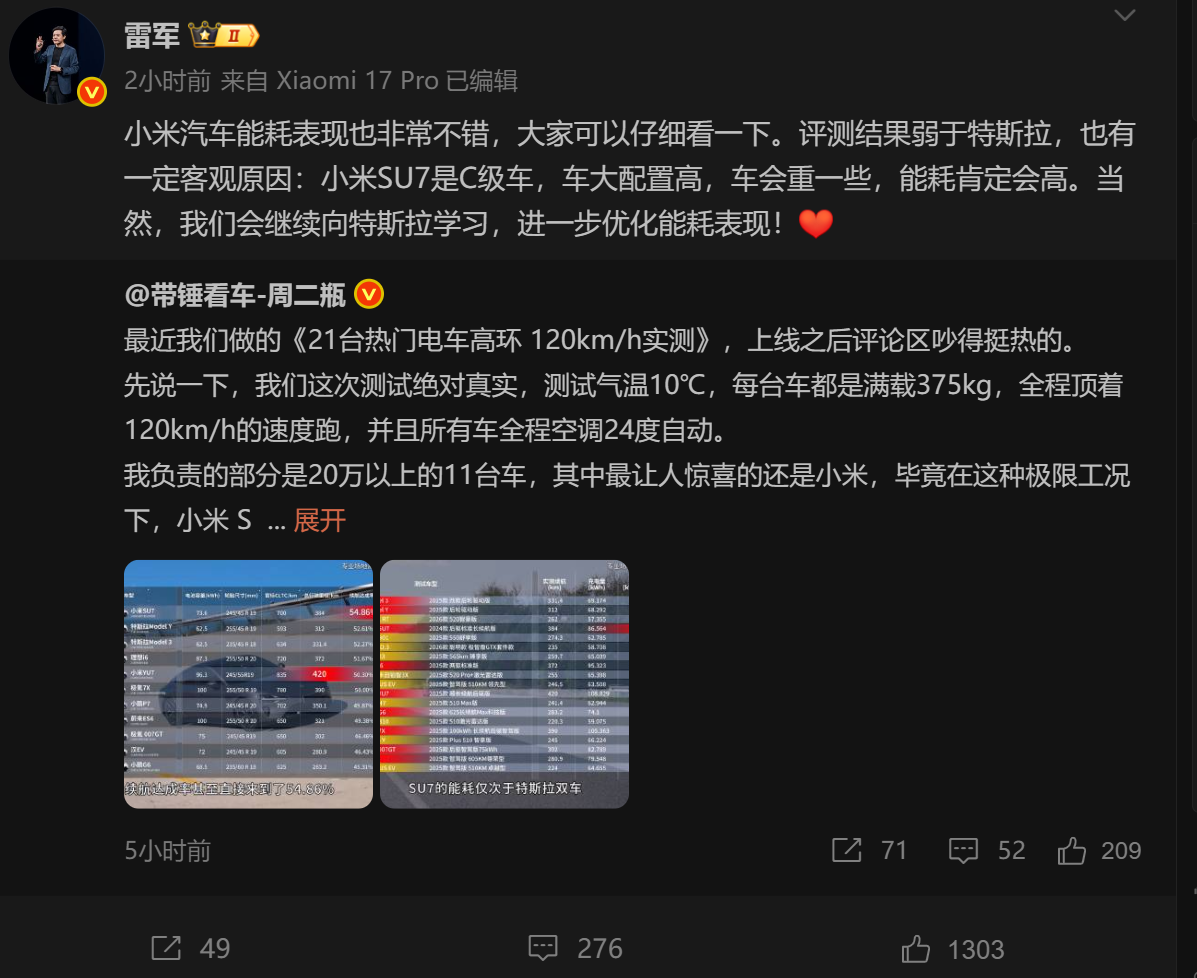 雷军并未回避小米和特斯拉之间的差距,反而直言不讳:“小米SU7是C级车,车大配置高,车重也重,能耗自然较高。”这番话也获得了一些网友的理解,毕竟车身重量与配置的高低,确实会影响到续航表现。