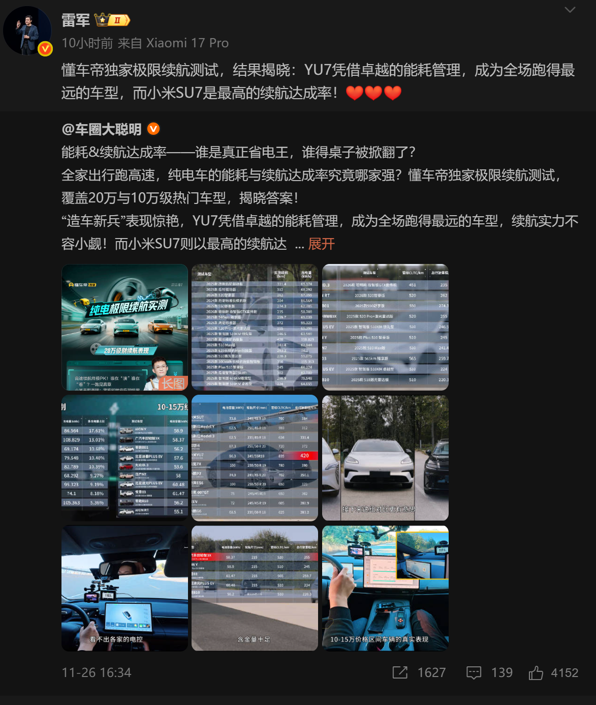 今日,雷军在微博上分享了一项由懂车帝进行的极限续航测试结果,引起了不少网友的热议。在这次极限续航测试中,小米两款车型——SU7和YU7以出色的表现,分别在续航“达成率”和“实际里程”上脱颖而出,挑战了市场上最具代表性的电动车——特斯拉。但是,这个话题也引发了不少争议,关于小米和特斯拉续航差距的问题,一时间成为了车迷们关注的焦点。