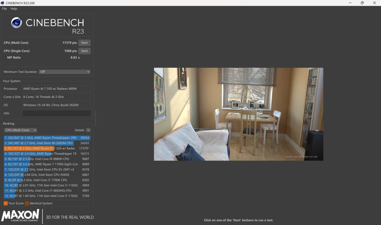 在Cinebench R23当中,锐龙AI 7 350处理器多核成绩17379pts,单核成绩 1968pts,跑分成绩非常不错,与当下的主流轻薄本产品表现相差无几。