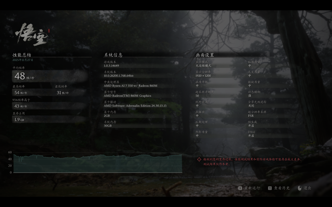 既然网游表现尚可,我们也测试了对性能要求极高的《黑神话:悟空》。同样在1920x1200分辨率、中画质下,开启FSR和帧生成后,平均帧可以达到48帧,对于一款核显本来说这样的表现显然是非常不错了,如果想要更流畅的体验也可以进一步降低画质。