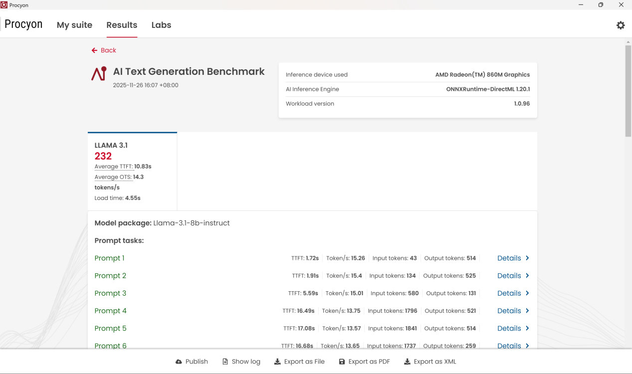 在UL Procyon AI Text Generation Benchmark中,针对各类本地大模型的加载以及输出token的速度,喵Book14 Pro的表现也十分出色,我们测试的LLama-3.1-8B项目获得232分平均延迟和每秒Token数量也都有着出色的表现,证明其性能可以充分满足上述AI大模型的使用需求。