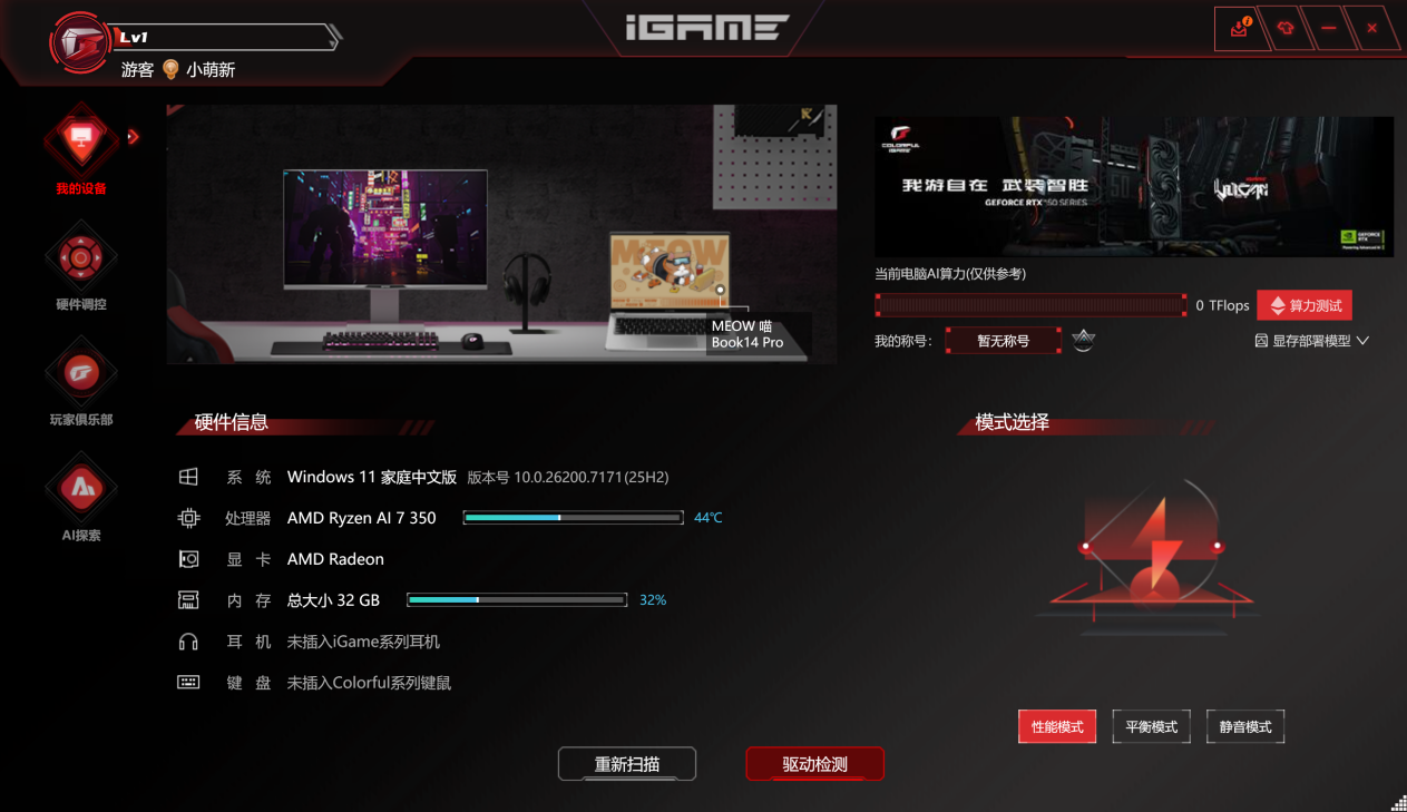 除此之外,喵Book14 Pro也预装了其游戏本以及板卡产品所配备的“自在星球”,也就是原来大家熟悉的iGame Center。支持在其中更新硬件驱动、调节参数以及性能模式等等功能。如果你用过七彩虹的游戏本或者主板、显卡,熟悉的界面和功能能让你轻松上手。