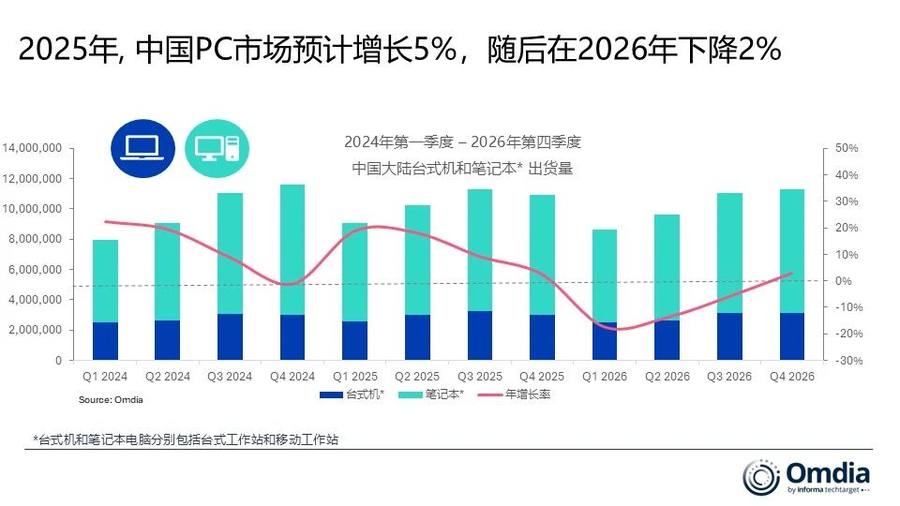 Omdia认为,过去两个季度,大型国有企业和政府机构仍保持较高水平的商用PC采购。随着信创生态体系内的国产替代加速推进,我们预计未来一年偏向本地供应PC零部件的采购需求将成为新的关键增长动力,特别是在消费补贴逐渐退坡的背景下。展望未来,Omdia对中国PC市场持谨慎乐观态度。预计到2025年底,中国PC市场将实现5%的同比增长,全年出货量达到4150万台。增长动力主要来自上半年稳健的消费需求和持续强劲的商用采购。然而,报告也预警了潜在风险,预计这一增长趋势可能在2026年发生转变,由于消费需求进一步走弱,市场预计将小幅下降2%。