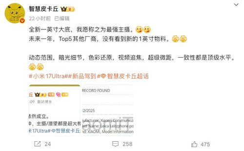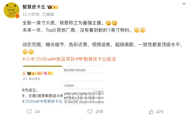 博主智慧皮卡丘最新爆料显示,小米17 Ultra将以影像为核心突破口,搭载全新徕卡1英寸主摄,号称“最强1英寸”,其动态范围、暗光细节捕捉及色彩还原能力均达到行业顶级水平,有望重塑高端手机影像格局。该机将于本月正式亮相,已引发数码圈广泛关注。