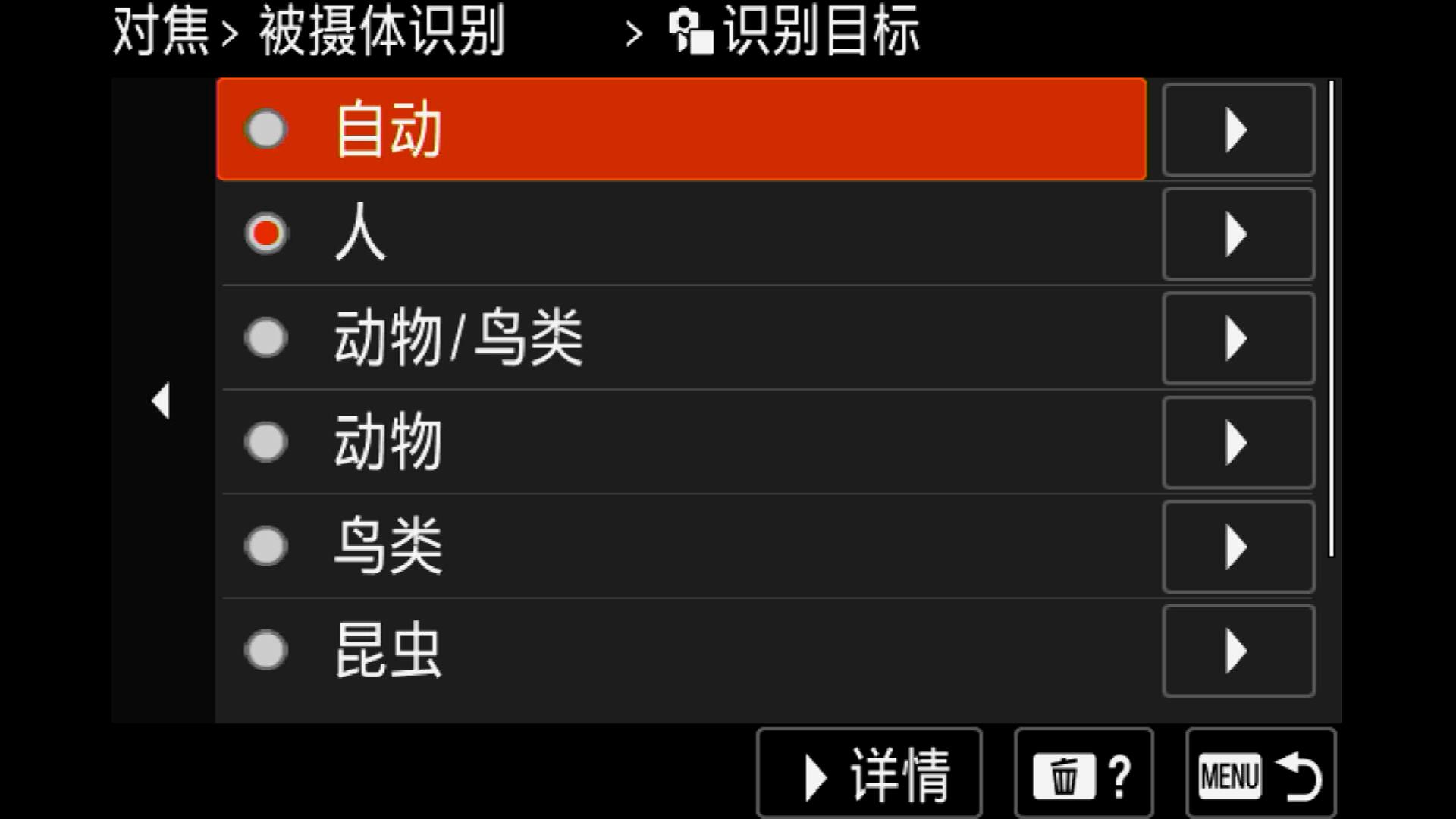 对焦系统一直是索尼的传统强项,而A7M5凭借AI处理单元将这份优势推向了新高度。新机搭载的BIONZ XR2 影像处理器首次整合了独立AI智能单元,不仅识别主体种类从A7M4的2类扩展至7类(人类、动物、鸟类、昆虫、汽车、火车、飞机),还新增了 “Auto自动识别” 模式,能根据场景智能切换识别对象,无需手动调整,大大提升了拍摄效率。