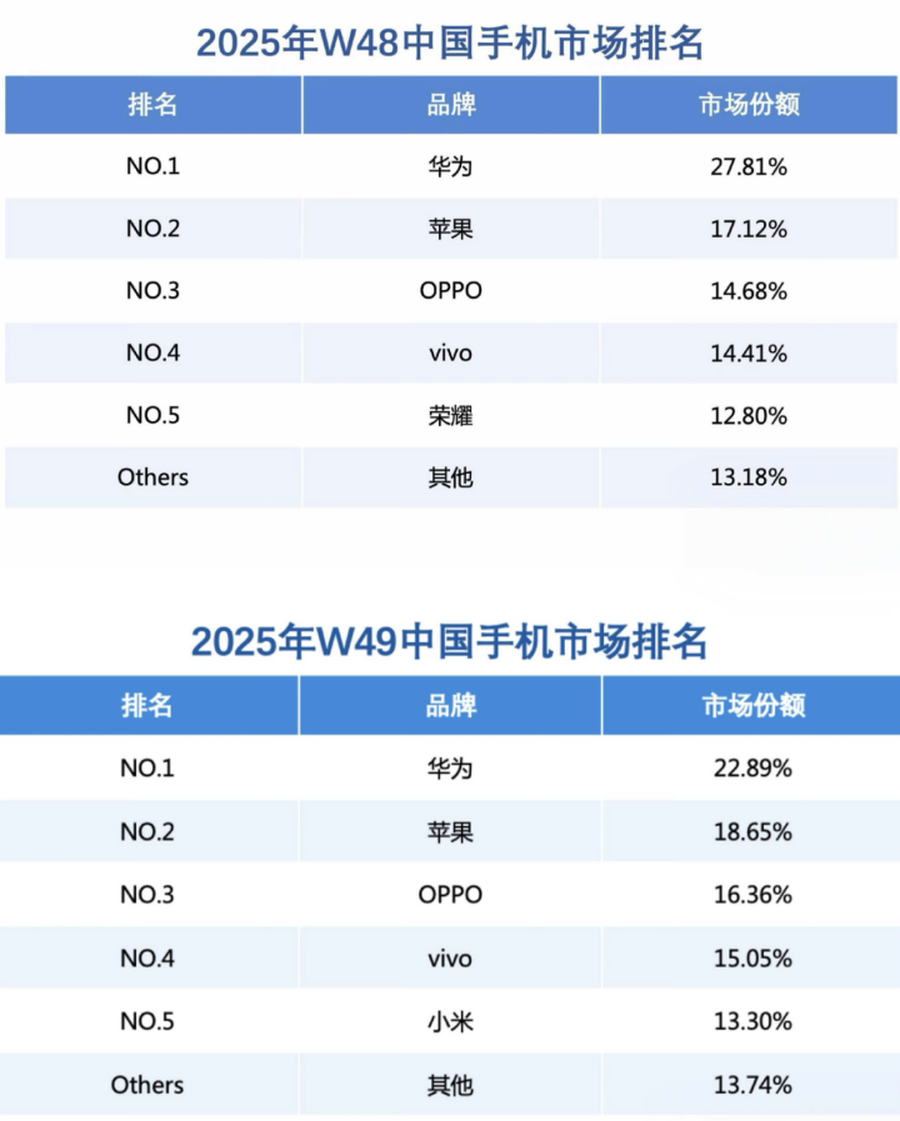 根据权威三方机构数据,自华为Mate 80系列发布以来,华为手机国内市场份额连续2周超越苹果,重夺国内市场份额第 一。