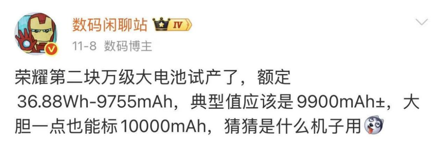 除了性能上的优势,荣耀WIN系列在续航上或将实现“断层领先”。早在11月8日,知名数码博主@数码闲聊站就曾爆料,荣耀新品或将配备高达10000mAh左右的超大容量电池。虽然并未明确产品归属,但外界预测,荣耀WIN系列的电池容量相较目前的性能旗舰而言,领先幅度巨大,值得期待。
