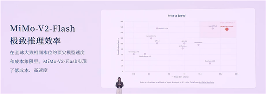 此外,MiMo-V2-Flash在全球顶尖模型的速度和成本对比中也表现出色,凭借低成本和高速度的优势,展现出其强大的市场竞争力。这使得它不仅适用于深度思考,还能够进行联网搜索,提供自然流畅的对话体验,并在需要实时数据和最新动态的场景中发挥重要作用。