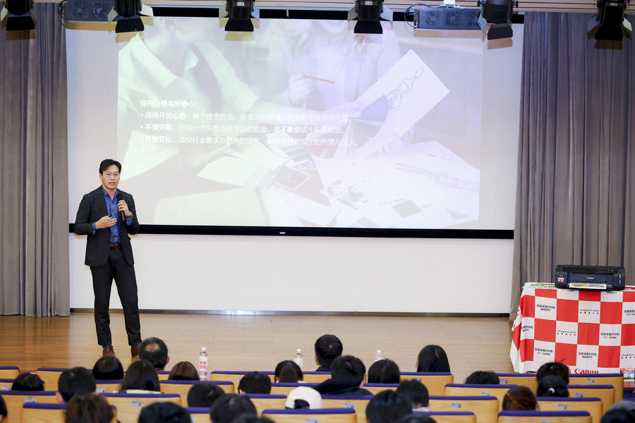 学长导师当代艺术实践者陆爽天和同学们分享了他设计生涯的“进阶之路”,通过多个品牌合作实例,启发同学们对自己的职业生涯多维度规划,设定长期目标。他谈到了打印如何帮助作品真正落地,带来更多的想象空间,以及佳能打印机在创作过程中的丰富应用,鼓励学生们将科技创新融入艺术创作。