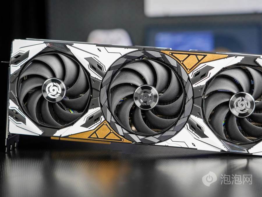 索泰RTX 5070 Ti 16GB天启OC显卡尺寸为902.5px x 345px x 182.5px,采用三槽半厚度设计,可兼容多数ATX中塔机箱。整体延续金属机甲风格,并借助黑白撞色与金色甲片点缀,使黑、白、金三色均匀分布,呈现出更为高端华贵的视觉效果。