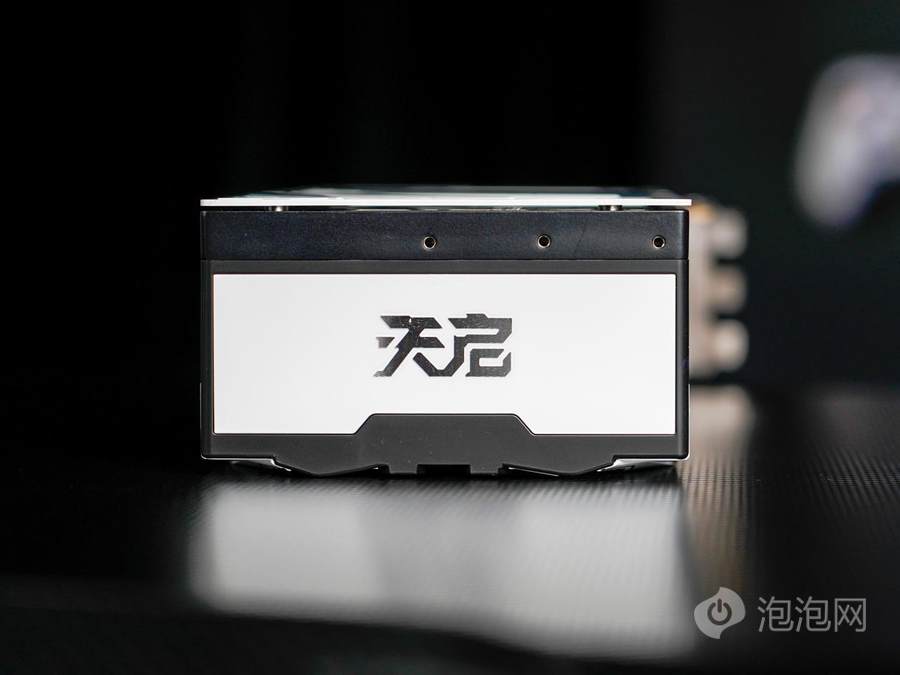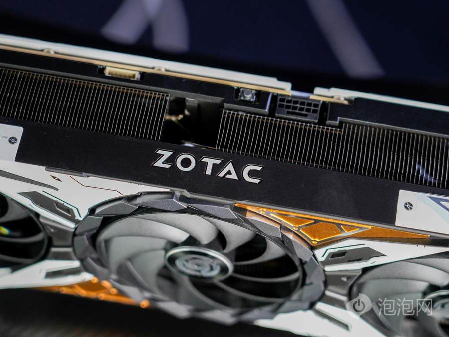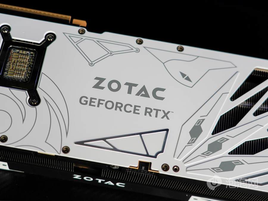 背板选用高强度合金材质,纯白配色延续机甲风格,尾部镂空区域有助于快速排出GPU核心热量,减少积热。印有ZOTAC GEFORCE标识与边角装饰图案,GPU核心位置则设计有天启系列LOGO线框图,透过镂空区域可看到内部高密度散热鳍片与热管。顶部与底部采用大面积镂空结构,露出排列整齐的高密度散热鳍片,进一步增强散热效能。