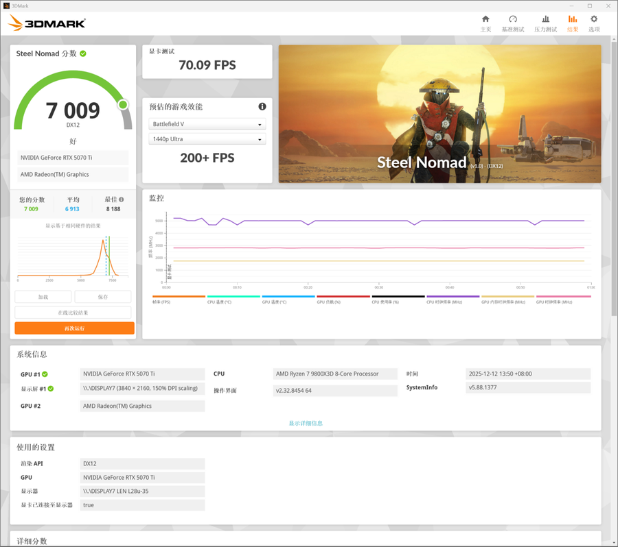 在3DMark测试可靠性、稳定性和持续性能的Steel Nomad测试中,索泰RTX 5070 Ti天启OC的总成绩为7009,其中显卡测试成绩为70.09 FPS,表现不错。