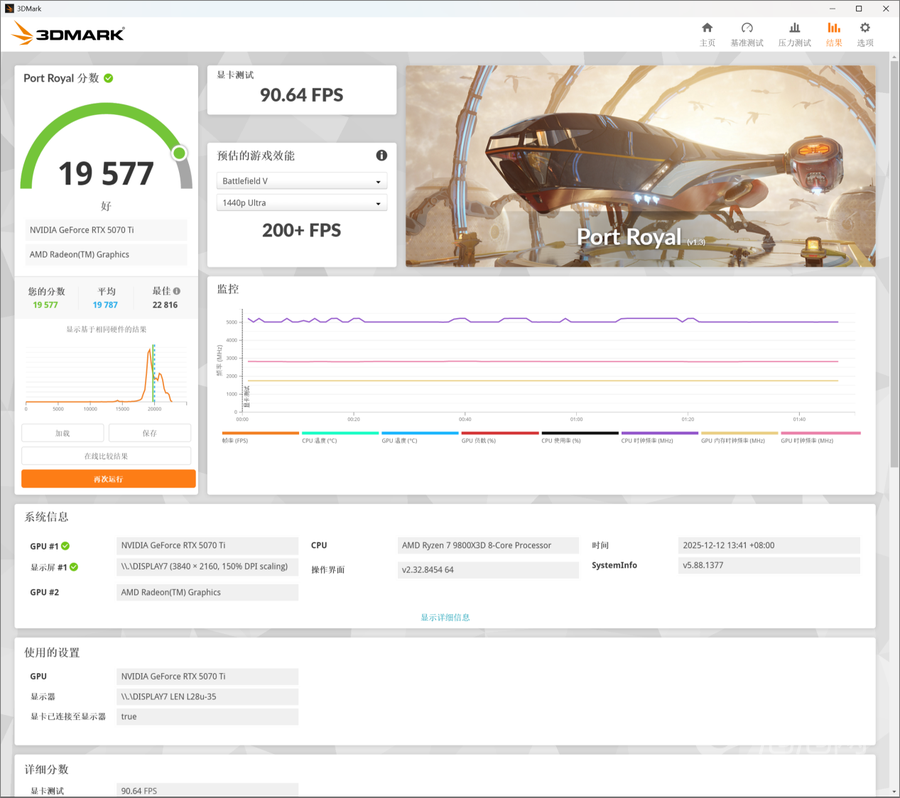 在3Dmark中测试实时光追性能的Port Royal测试中,索泰RTX 5070 Ti天启OC的总成绩为19577,其中显卡测试成绩为90.64FPS。