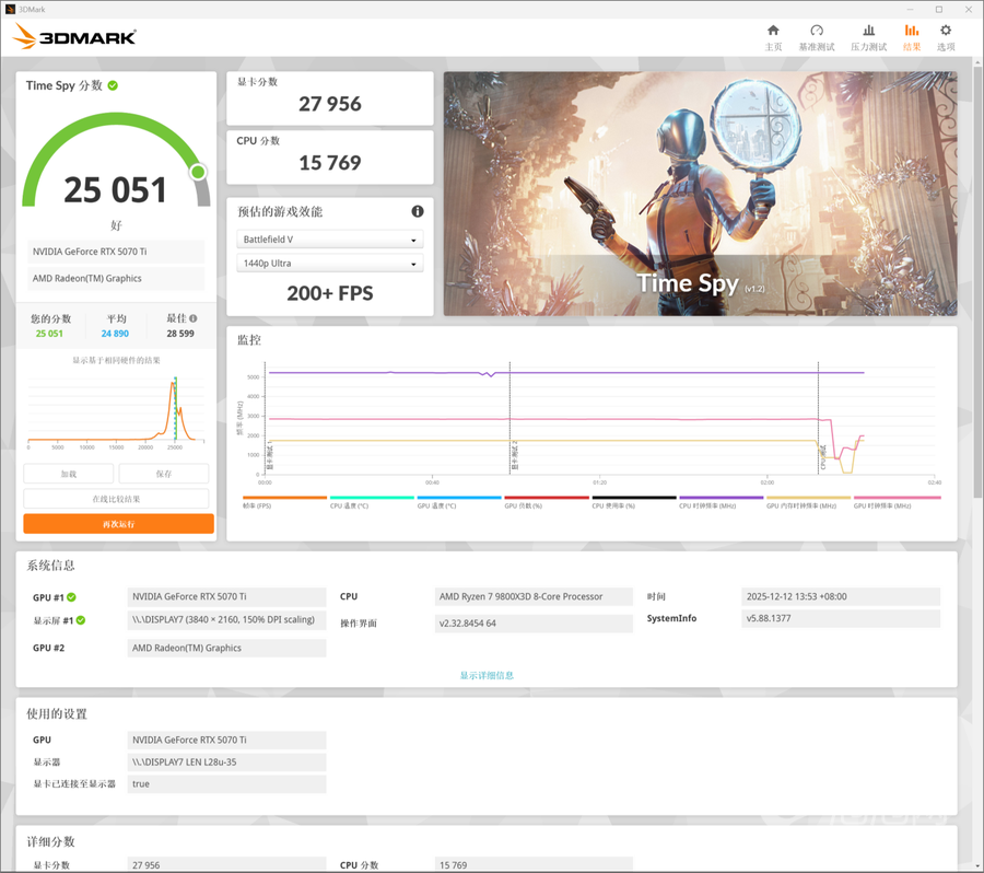 在大家最为熟悉的3DMark Time Spy(DX 12+2K渲染分辨率)测试中索泰RTX 5070 Ti天启OC的总成绩为25051,其中显卡分数为27956。