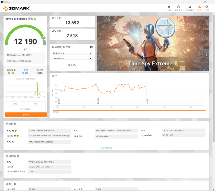 在3DMark的Time Spy Extreme(DX 12+4K渲染分辨率)测试中,索泰RTX 5070 Ti天启OC的总成绩为12190,其中显卡分数为13692。