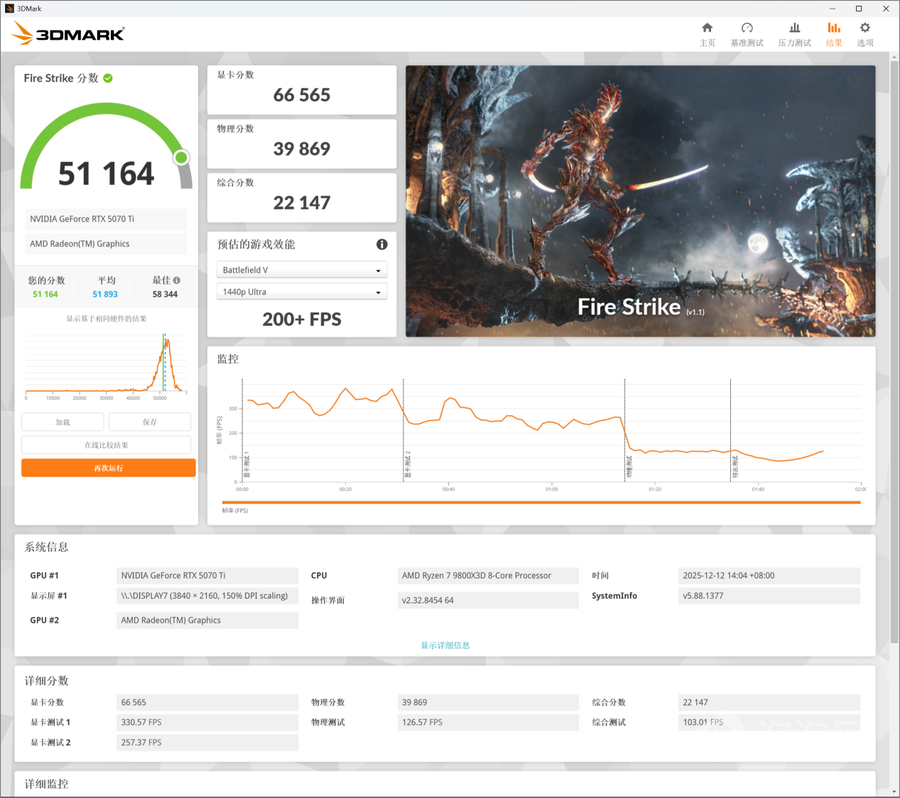 在3DMark的Fire Strike(DX 11+1080P渲染分辨率)测试中,索泰RTX 5070 Ti天启OC的总成绩为51164,其中显卡分数为66565。