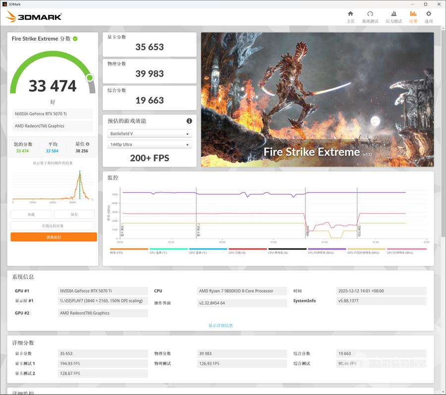 在3DMark的Fire Strike Extreme(DX 11+2K渲染分辨率)测试中,索泰RTX 5070 Ti天启OC得分为33474,其中显卡分数为35653。