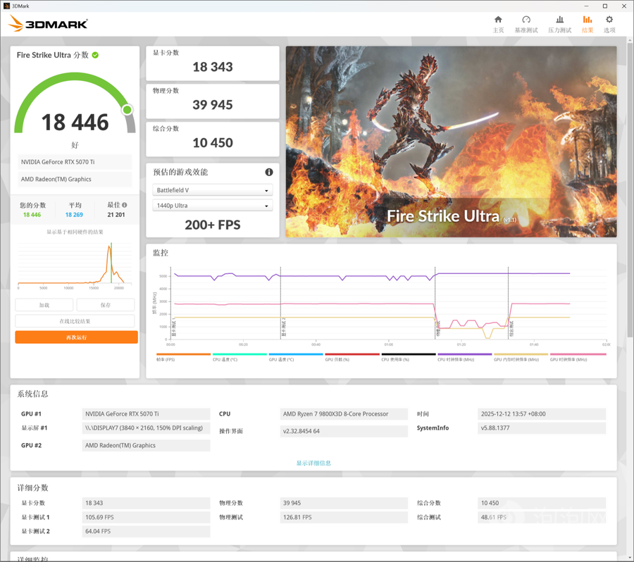 在3DMark的Fire Strike Ultra(DX 11+4K渲染分辨率)测试中,索泰RTX 5070 Ti天启OC得分为18446,其中显卡分数为18343。