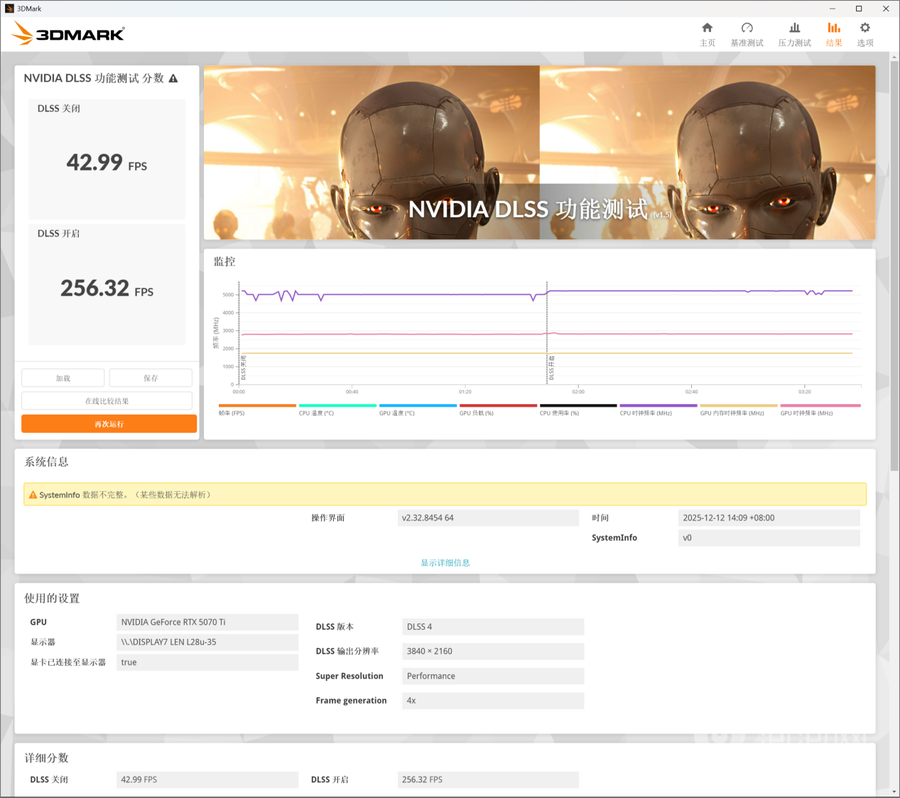 3Dmark NVIDIA DLSS功能测试可以测试最新的DLSS 4性能,实测索泰RTX 5070 Ti天启OC在关闭DLSS 4时原生帧数为43FPS左右,开启DLSS 4 2x之后帧数上升为155.12FPS,开启DLSS 4 3x之后帧数上升为211.57FPS,开启DLSS 4 4x之后帧数上升为256.32FPS。