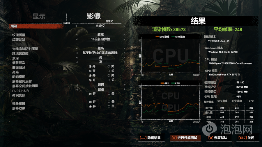 在《古墓丽影:暗影》中,使用4K分辨率、最高画质并开启光线追踪的条件下进行测试,,DLSS超级采样设置为平衡,平均帧为152帧,将分辨率进一步降低到2K之后,平均帧率提升至248帧。
