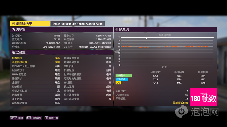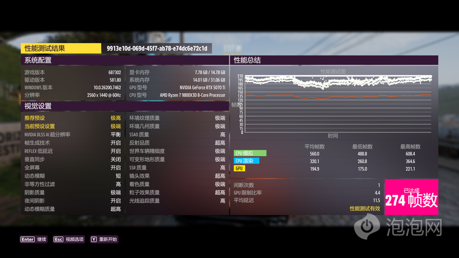 在《极限竞速:地平线5》中,使用4K分辨率、极端预设的条件下进行测试,,DLSS超级采样设置为平衡并开启帧生成后,平均帧为180帧,将分辨率进一步降低到2K之后,平均帧率提升至274帧。