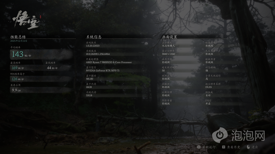 在《黑神话:悟空》中,使用4K分辨率、影视级画质并开启光线追踪的条件下进行测试,,超采样清晰度设置为50时,平均帧为143帧,将分辨率进一步降低到2K之后,平均帧率提升至215帧。