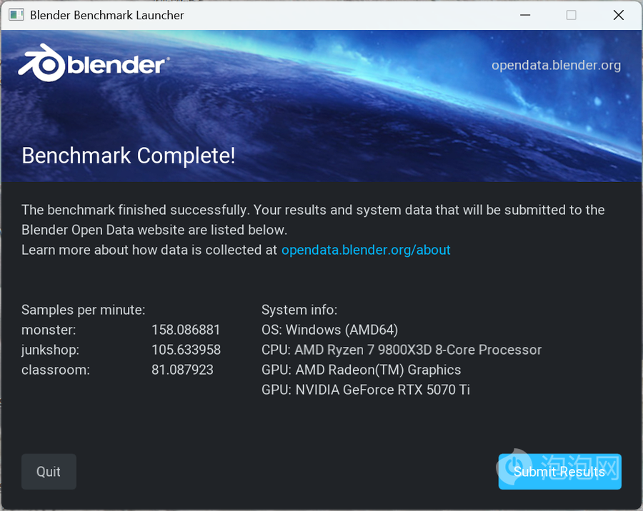 基于3D设计渲染软件Blender Cycles的Blender Benchmark测试中,使用RTX 5070 Ti 天启OC显卡进行渲染,monster、junkshop、classroom三个场景中渲染速度相比仅使用CPU大大加快,有助于在生产力场景提高效率。