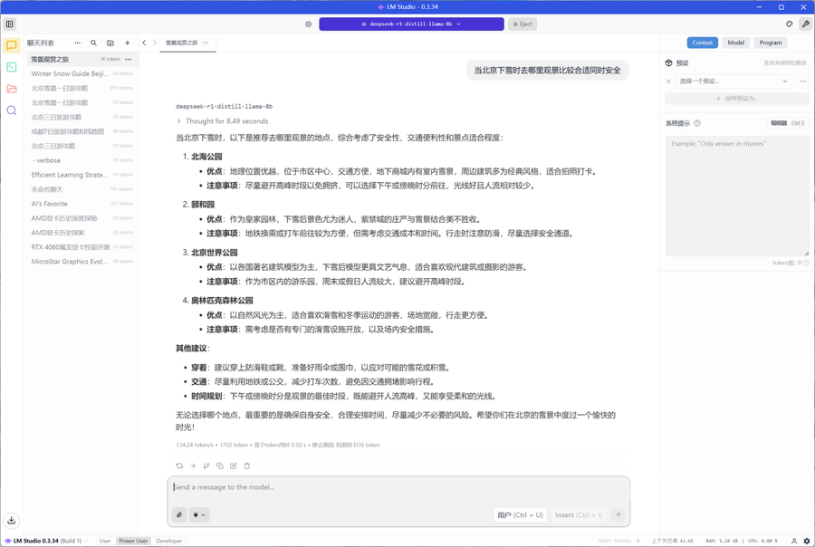 最后,我们也使用LM Studio实际体验了在索泰RTX 5070 Ti天启OC上本地运行大模型的体验。我们使用Deepseek-R1-Distill-llama-8B模型进行了本地提问测试。最终生成了1702个token,首token用时仅0.02s,生成速度达到了每秒134.24 token,带来了非常出色的本地大语言模型使用体验。