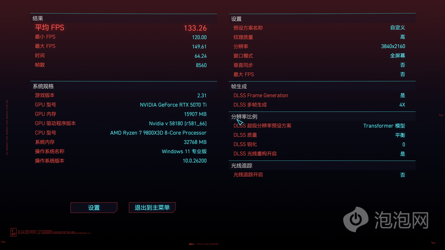 在《赛博朋克2077》中,使用4K分辨率、光线追踪:超速预设、DLSS超级采样设置为平衡、并且开启4X帧生成的条件下进行测试,平均帧为152帧,将分辨率进一步降低到2K之后,平均帧率提升至248帧。