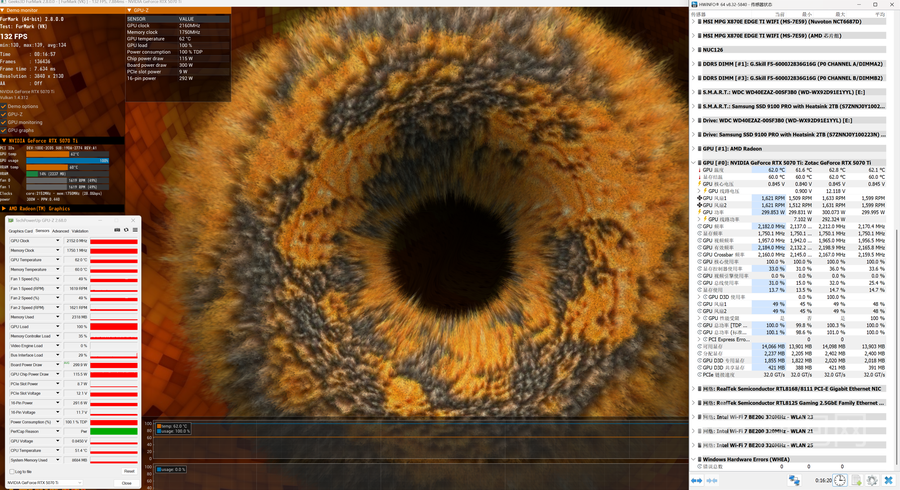 最后我们来看看功耗表现。我们使用FurMark 2在4K分辨率下进行了15分钟的烤机测试,RTX 5070 Ti 天启OC的平均CPU功耗(Board Power Draw)为299瓦,基本跑满TDP上限。得益于散热系统的高效,GPU平均温度仅有62.1°C,核心频率为2152MHz,性能输出是又强又稳。